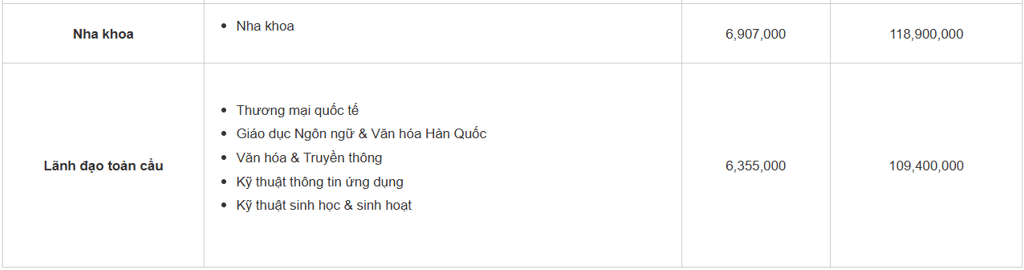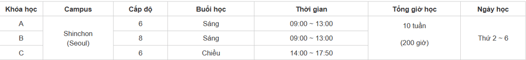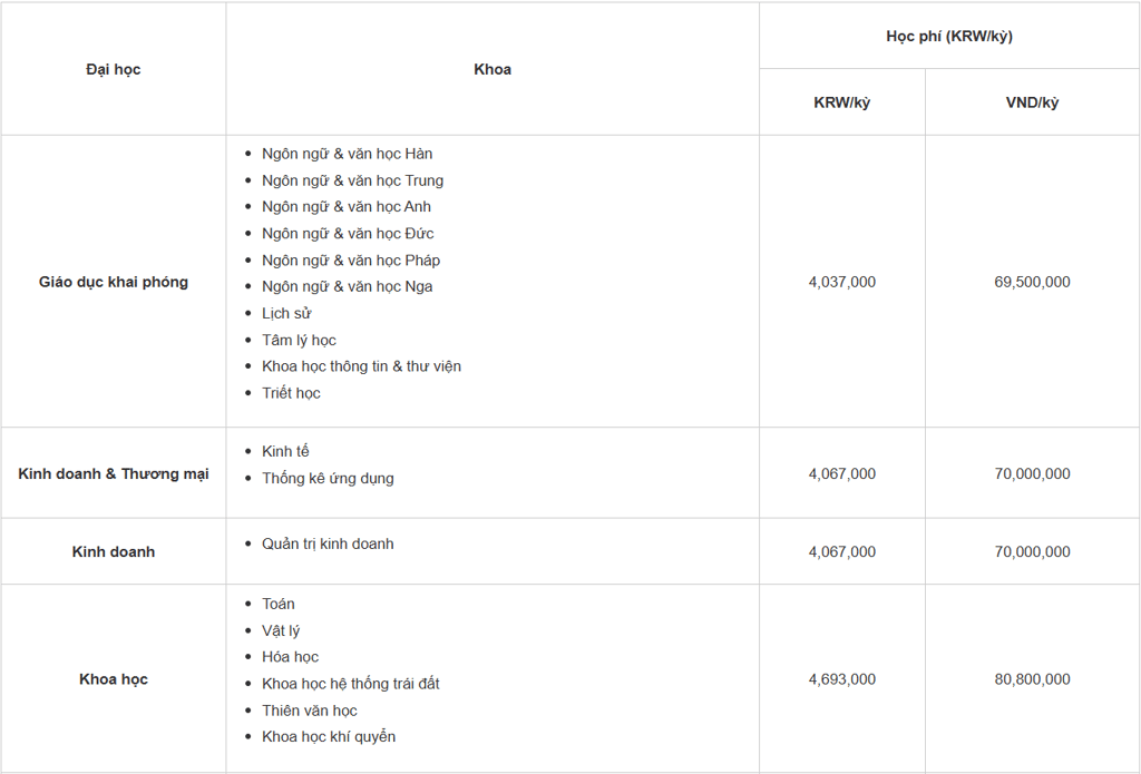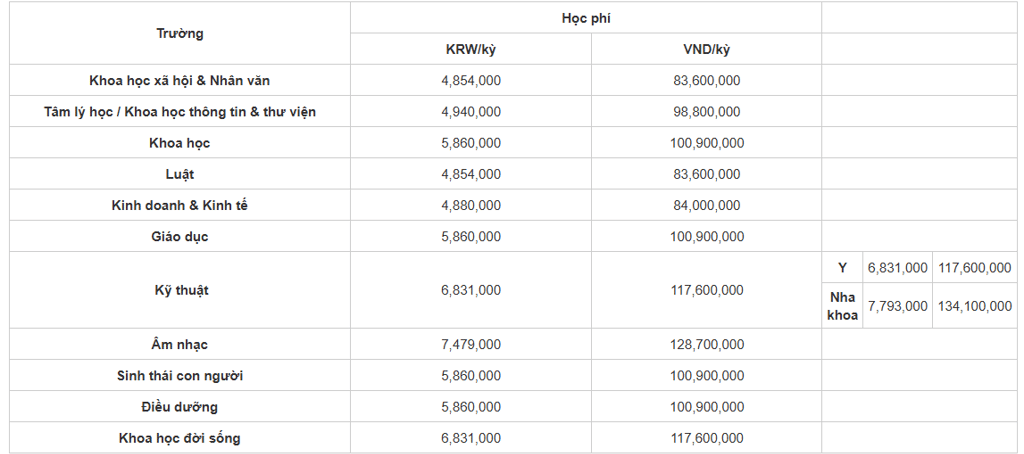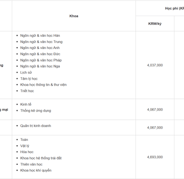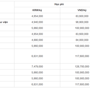 Học phí: 1.730.000 KRW mỗi kỳ, tương đương 34.600.000 VND.