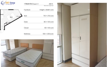 KTX sẽ bao gồm hai loại phòng: Phòng đôi với 2 giường đơn và Phòng bốn người với 2 giường tầng. Mỗi phòng đều được trang bị bàn học, ghế, sử dụng chung Wifi. Chăn, gối, ga trải giường sẽ được cung cấp khi sinh viên chuyển vào.
