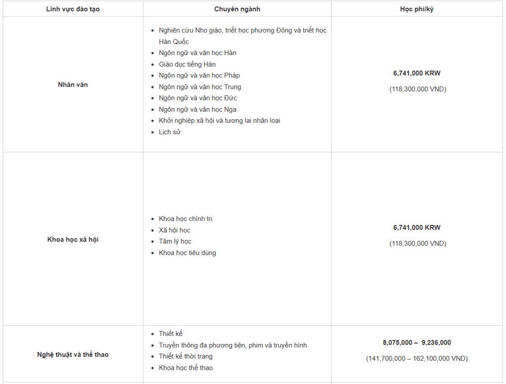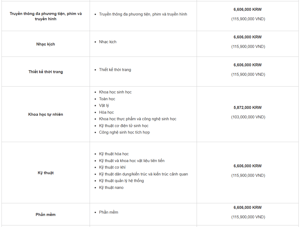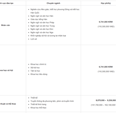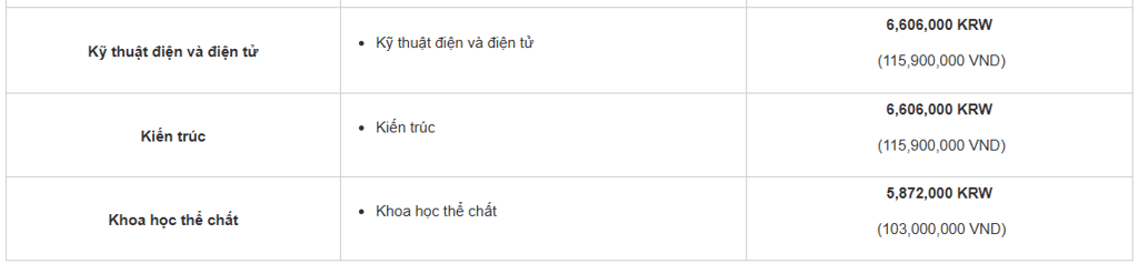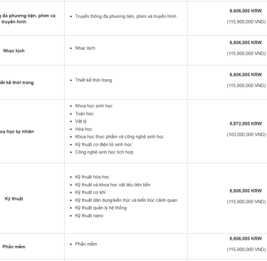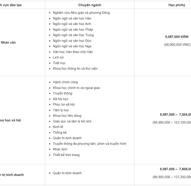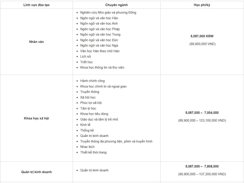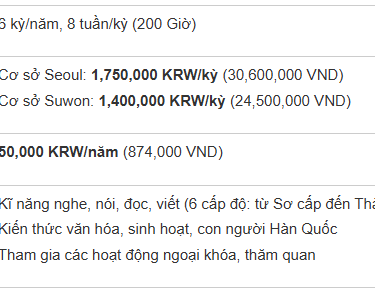 Học phí: 1,700,000 KRW/ kỳ (Seoul) và 1,400,000 KRW/ kỳ (Suwon)